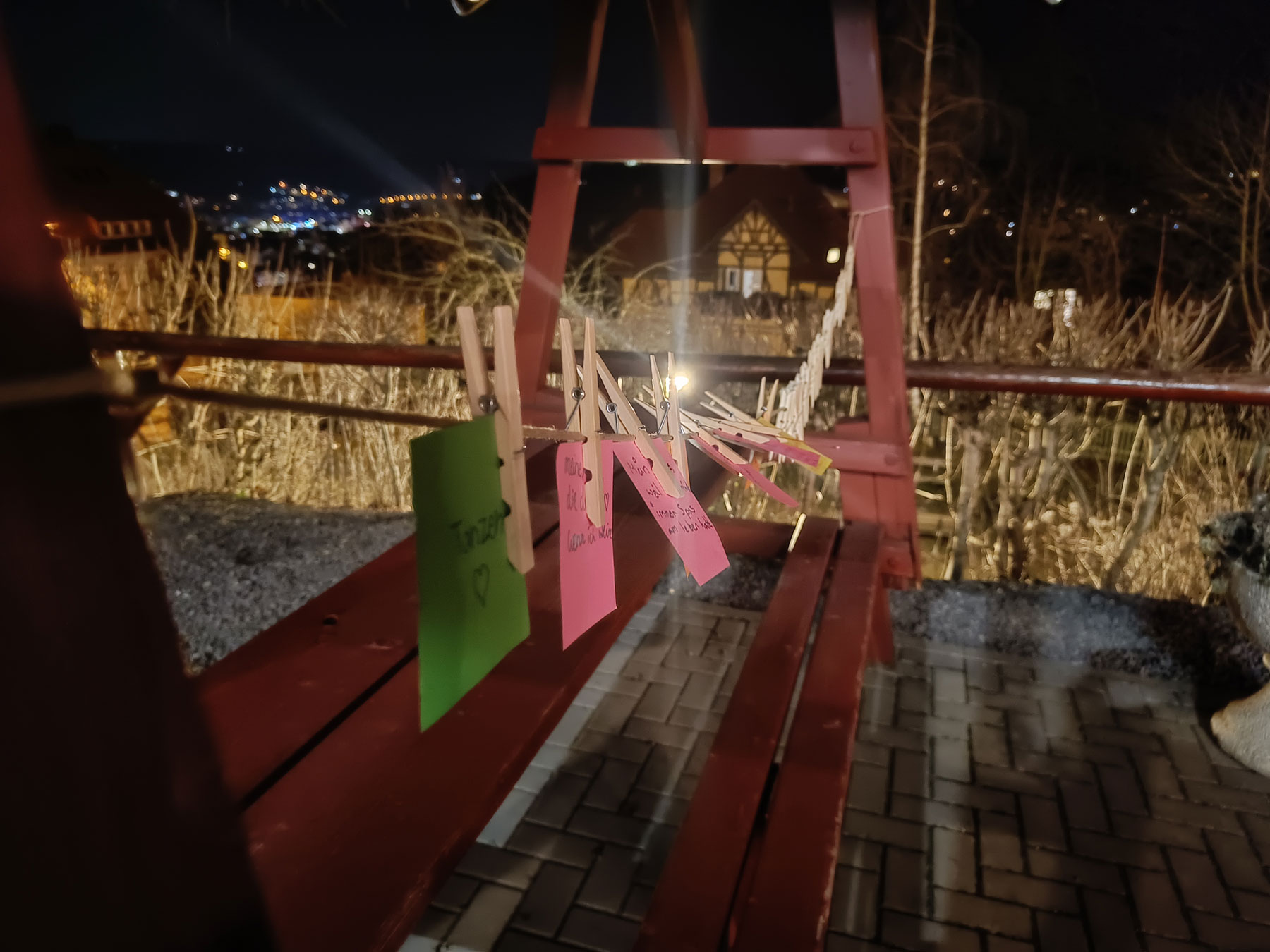 Rote Holzschaukel bei Nacht mit bunten Karten, die an einer Schnur befestigt sind; dahinter Stadtbeleuchtung und Haus.